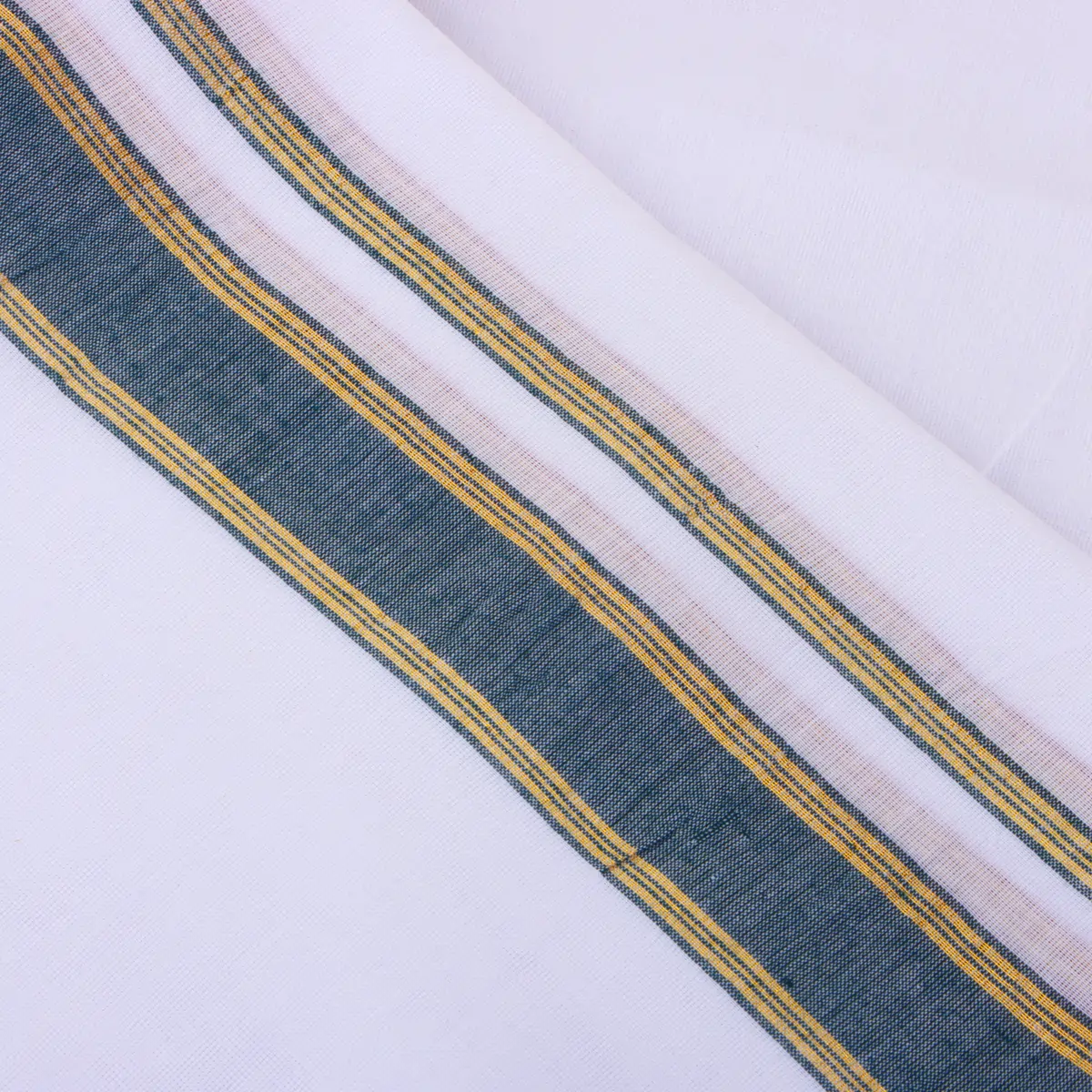 • The Mayilkan border has been used to highlight this dhoti, giving it a rich, detailed texture.