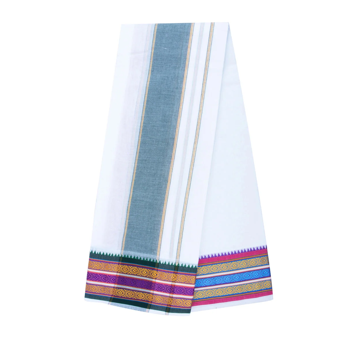 • The Mayilkan border has been used to highlight this dhoti, giving it a rich, detailed texture.